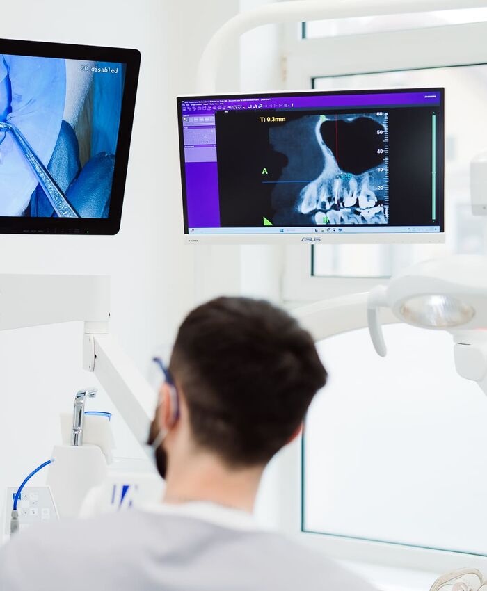 Od roku 2020 je súčasťou nášho RTG pracoviska aj modené 3D RTG / CT vyšetrenie s maximálnou plochou snímania až 16 × 18 cm. Je to špeciálne röntgenové vyšetrenie, ktoré vytvára trojrozmerný obraz vašej ústnej dutiny. Oproti bežnému 2D snímkovaniu poskytuje omnoho presnejšie informácie pre diagnostiku zubov, koreňov, čeľustí a okolitých štruktúr. Vďaka tejto technológii vieme navrhnúť liečbu s maximálnou presnosťou a bezpečnosťou.